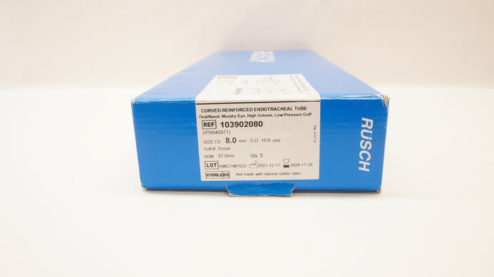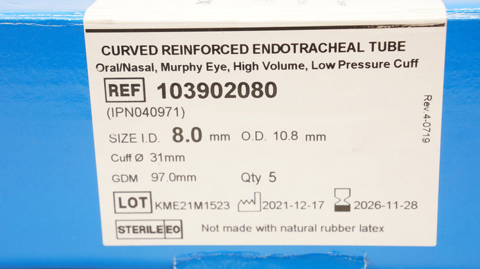 - Teleflex 103902080 Curved Endotracheal Tube 8.0mm I.D. x 10.8mm O.D. - Box of 5