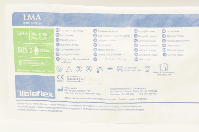 - Teleflex 175030 LMA Supreme Laryngoscope Mask Airway Size 3 30-50kg<30ml/60cm(x)