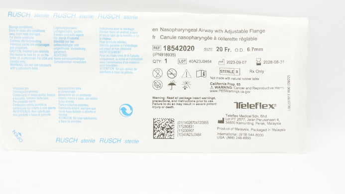 - Teleflex 18542020 Rusch Nasopharyngeal Airway w/Adjustable Flange 20Fr x 6.7mmOD