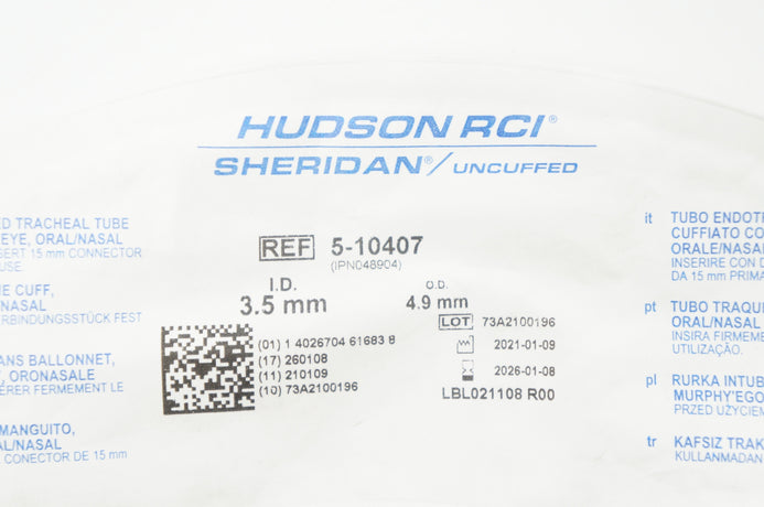 - Teleflex 5-10407 Hudson RCI Sheridan Tracheal Tube Uncuffed 3.5mm ID x 4.9mm OD