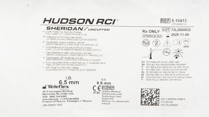 - Teleflex 5-10413 Hudson RCI Sheridan Uncuffed Tracheal Tube 6.5mm ID x 8.9mm OD