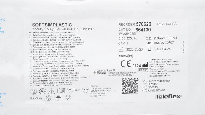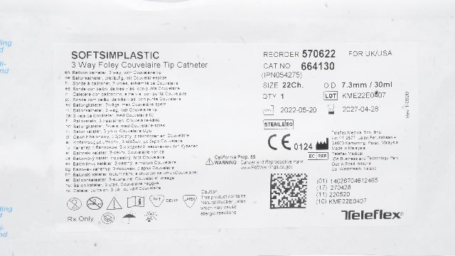 - Teleflex 570622 Softsimplastic 3 Way Foley Couvelair Tip Cath. 22Ch x 7.3mmOD
