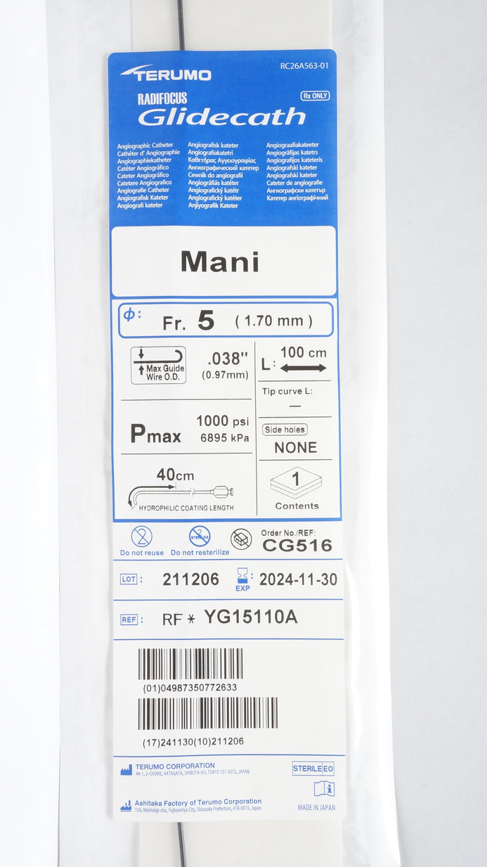 - Terumo YG15110A Radifocus Glidecath Angiographic Cath. 5Fr x .038inch x 100cm