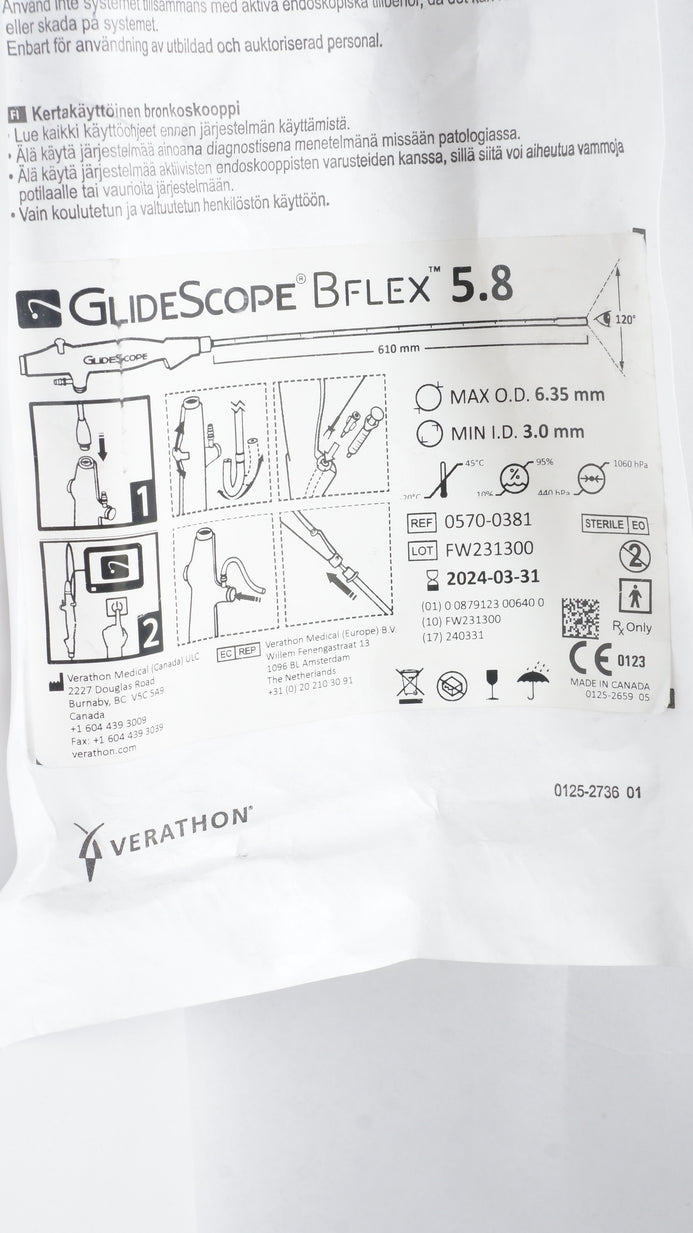 - Verathon 0570-0381 GlideScope BFlex 5.8 Bronchoscope 6.35mm ID x 3.0mm OD (x)