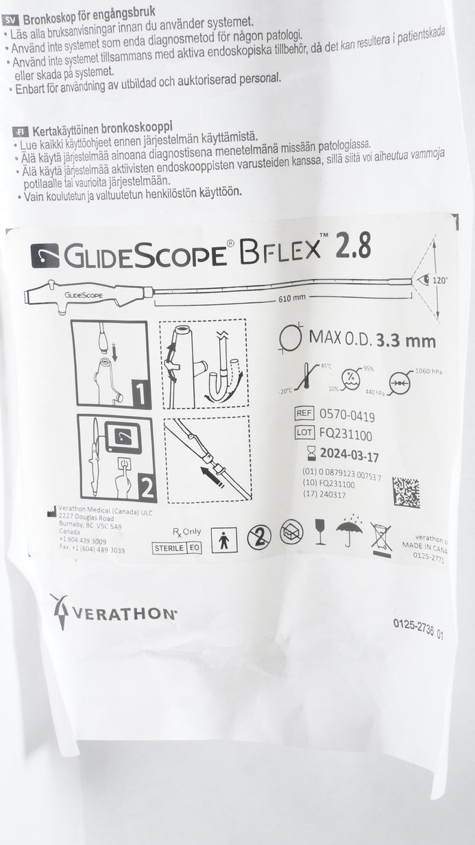 - Verathon 0570-0419 GlideScope Bflex 2.8 Single-Use Bronchoscope 3.3mm O.D. (x)