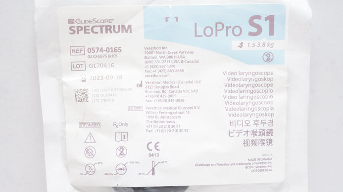 - Verathon 0574-0165 GlideScope Spectrum LoPro S1 Video Laryngoscope 1.5-3.8kg (x)