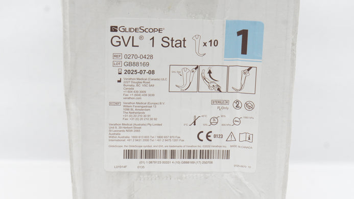 - Verathon Medical 0270-0428 Glide Scope GVL 1Stat Video Laryngoscope - Box of 10