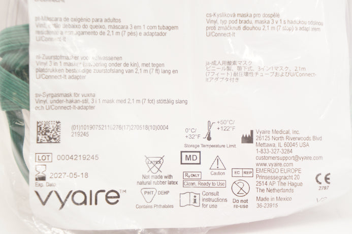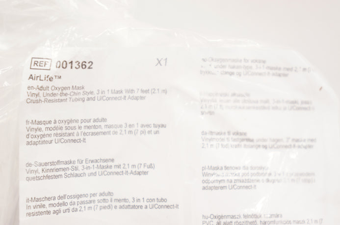 - Vyaire 001362 AirLife Adult Oxygen Mask Vinyl w/7ft. Tubing & U/Connect Adapter (x)