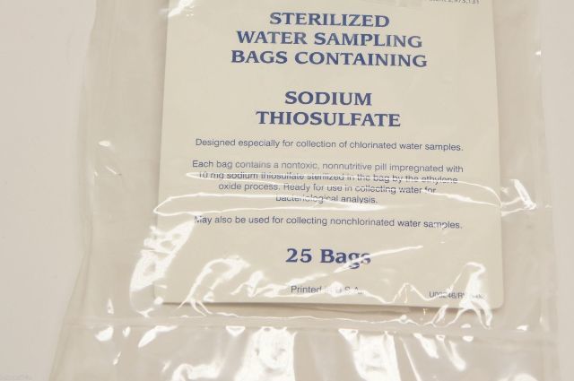 Special features: sterile; 7 in. h; 3 in. (76.20 mm) w; designed for collecting 100 ml chlorinated or non-chlorinated samples for bacteriological analysis; contains 10 mg sodium thiosulfate; used in neutralizing chlorine; four bags of 25 each; pull tab opening