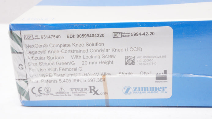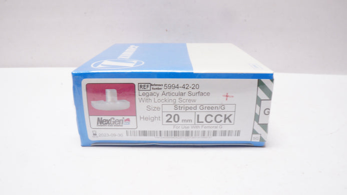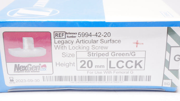 - Zimmer 5994-42-20 Legacy Articular Surface w/Locking Screw, Striped Green/G 20mm