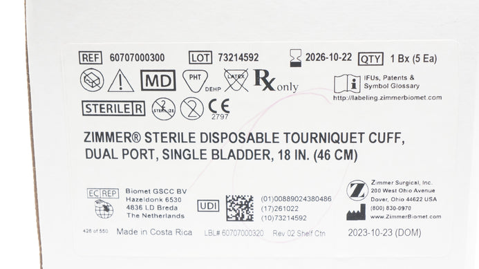 - Zimmer 60707000300 Tourniquet Cuff, Dual Port, Single Bladder, 18in.-Box of 5