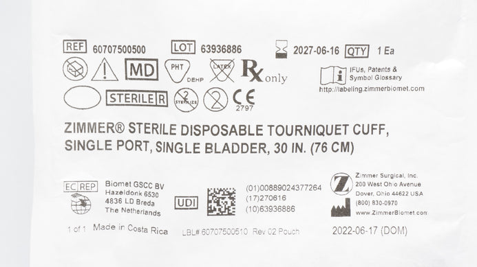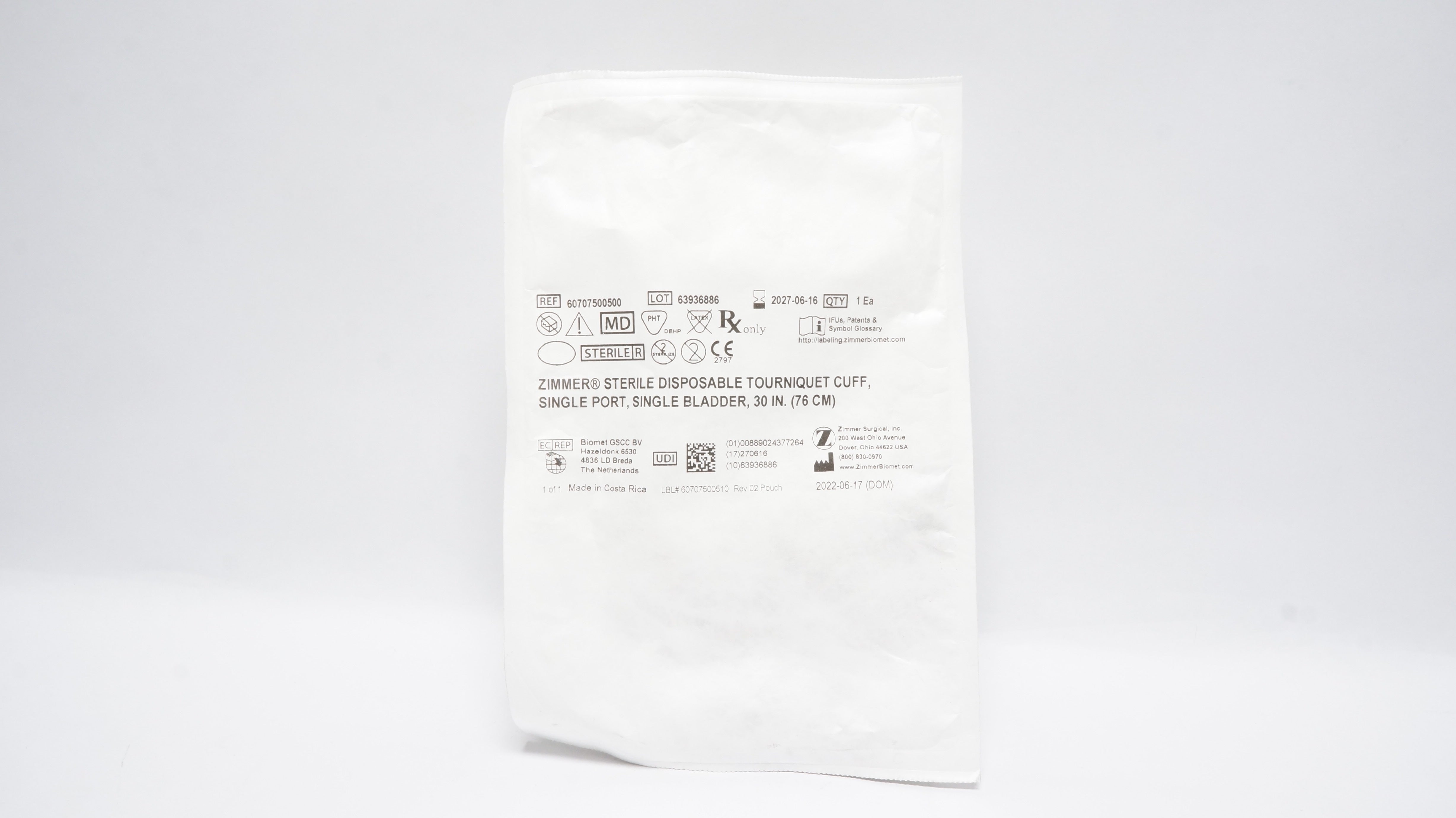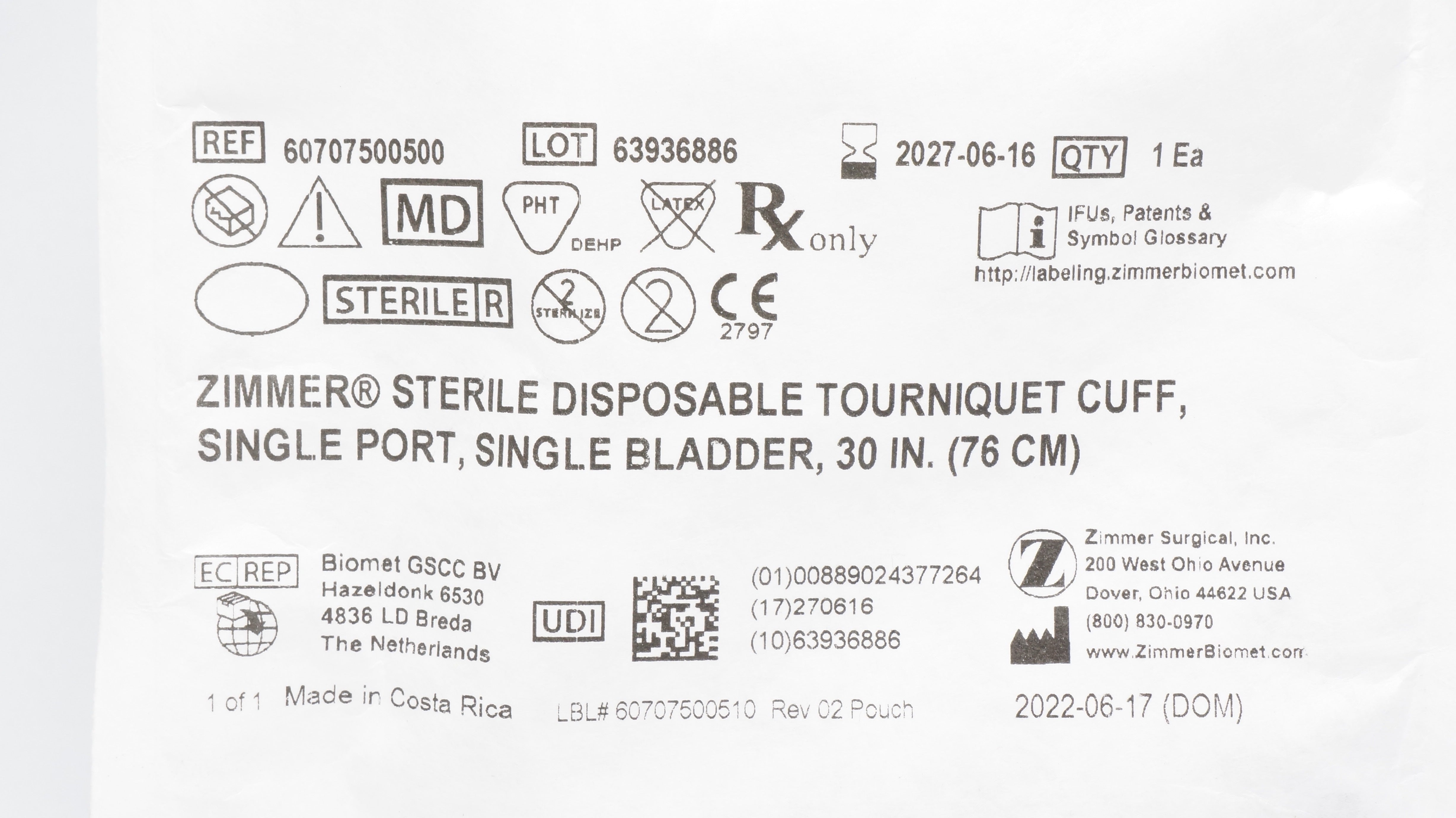 - Zimmer 60707500500 Disposable Tourniquet Cuff Single Port Single Bladder, 30inch