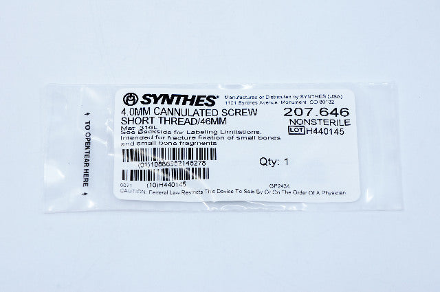 - Synthes 207.646 4.0mm Cannulated Screw Short Thread 46mm