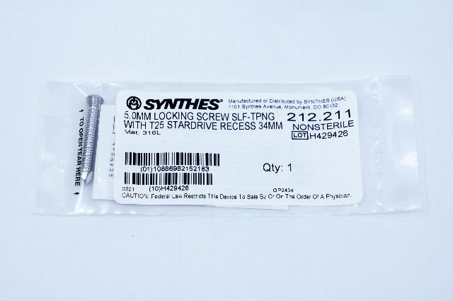 - Synthes 212.211 5.0mm Locking Screw Self-Tapping With T25 Stardrive Recess 34mm