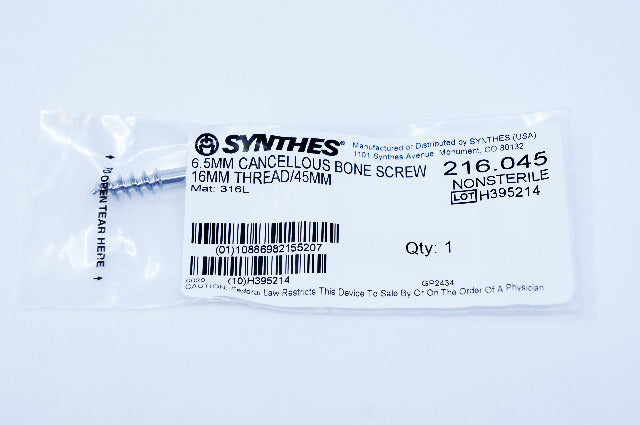 - Synthes 216.045 6.5mm Cancellous Bone Screw 16mm Thread/45mm