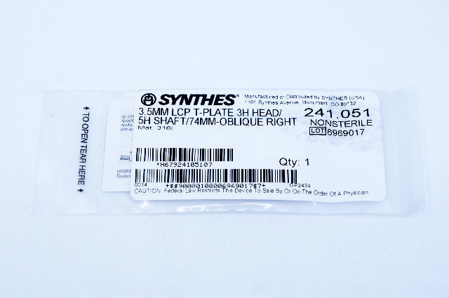 - Synthes 241.051 3.5mm LCP T-Plate 3H Head/5H Shaft/74mm - Oblique Right