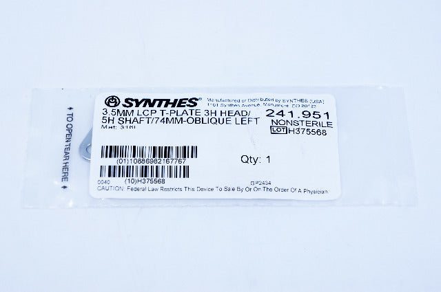 - Synthes 241.951 3.5mm LCP T-Plate: 3H Head / 5H Shaft / 74mm / Oblique Left