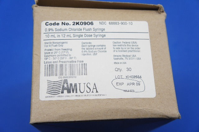 - Amusa 2K0906 0.9% Sodium Chloride Flush Syringe 10mL in 12mL Syringe ~ Box of 30 (x)