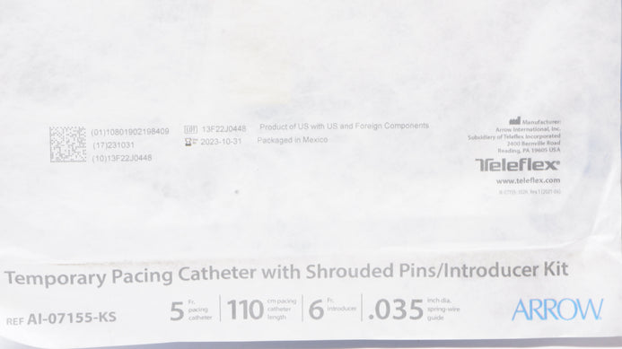 Arrow AI-07155-KS Temporary Pacing Catheter with Shrouded Pin/Introducer Kit 5Fr x 6 Fr x .035inch x 110cm