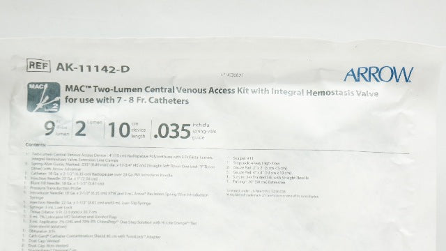 - Arrow AK-11142-D MAC Two-Lumen Central Venous Access Kit 9Fr x 10cm x 0.035inch