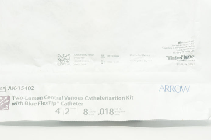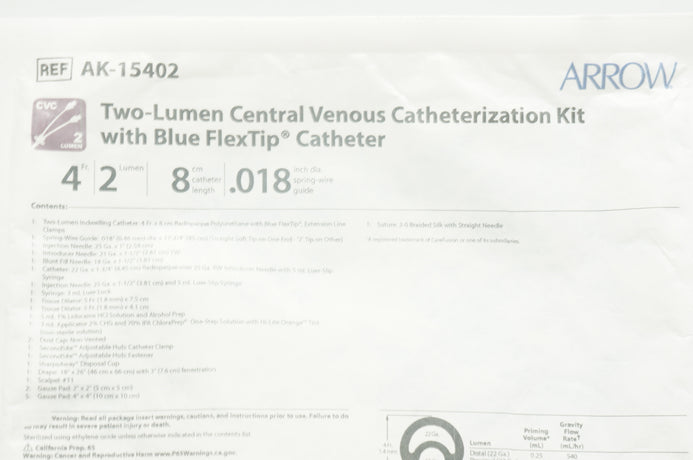 - Arrow AK-15402 Two-Lumen CVC Kit W/ Blue FlexTip Cath. 4Fr. x 8cm x 0.018in.