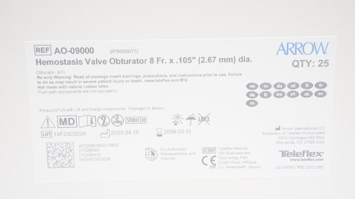 - Arrow AO-09000 Hemostasis Valve Obturator 8Fr x .105inch dia. - Box of 25
