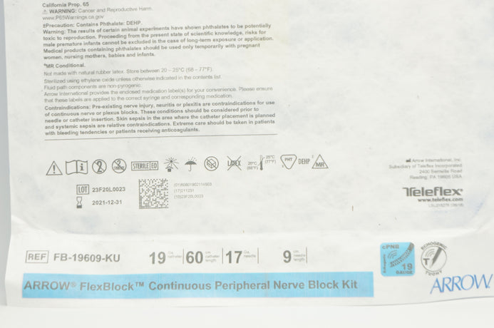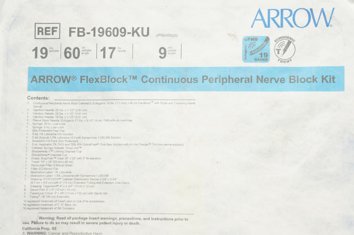 - Arrow FB-19609-KU FlexBlock Peripheral Nerve Block Kit 19Ga x 60cm x 17Ga x 9cm