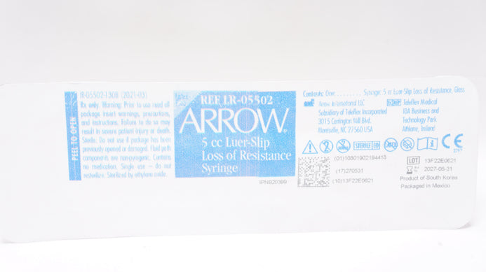 - Arrow LR-05502 Luer-Slip Loss of Resistance Syringe 5cc