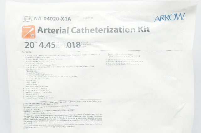 - Arrow NA-04020-X1A Arterial Catheterization Kit 20Ga x 4.45cm x 0.018inch