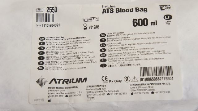 - Atrium 2550 Ats Blood Bag Chest Drain Autotransfusion 600ml