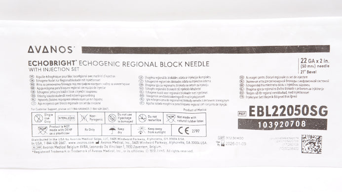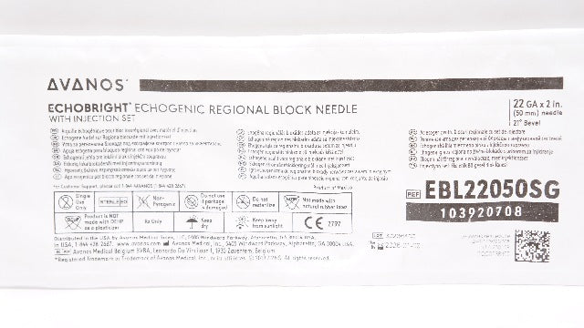 Avanos EBL22050SG EchoBright Echogenic Regional Block Ndle 22Ga x 2inch