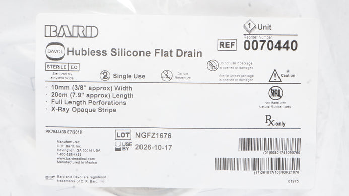 Bard 0070440 Davol Hubless Silicone Flat Drain 3/8inch x 7.9inch
