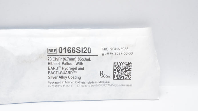 Bard 0166SI20 Bardex Infection Control Foley Catheter 20Ch/Fr 30cc/mL Ribbed Balloon With Hydrogel and Bacti-Guard Silver Alloy Coating