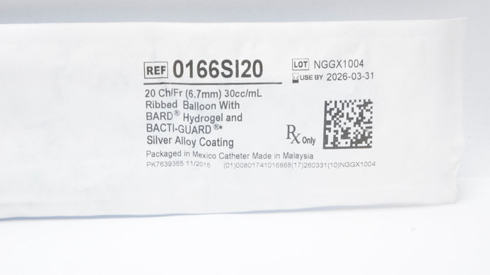 Bard 0166SI20 Bardex Infection Control Foley Cath. 20Ch/Fr 30cc/mL Ribbed Balloon With Hydrogel and Bacti-Guard Silver Alloy Coating