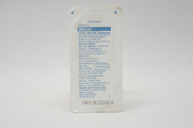 - Baxter 2B8071 Vial-Mate Adaptor w/20mm Closure & Viaflex 50,100,250ml Containers