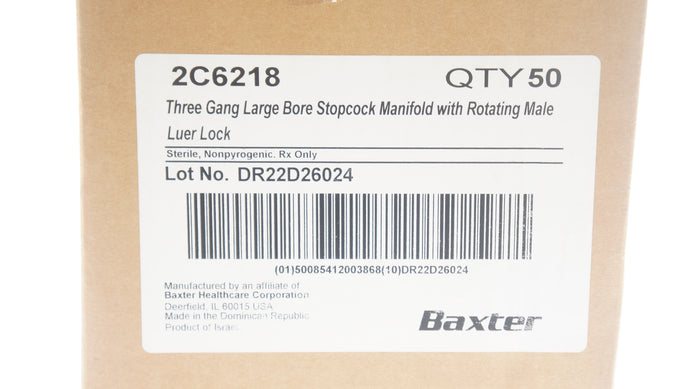 - Baxter 2C6218 Three Gang Large Bore Stopcock Manifold w/Rotating Male Luer Lock