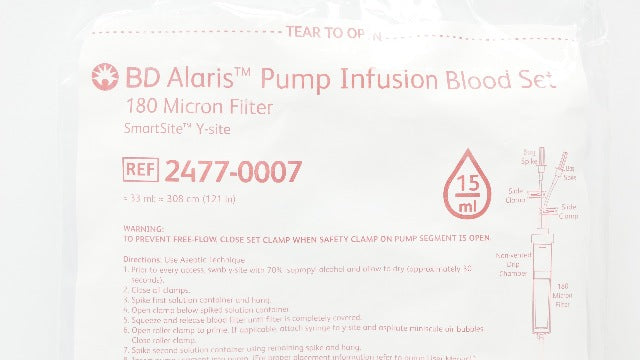 BD 2477-0007 Alaris Pump Infusion Blood Set 180Micron Filter, Smart-Site Y-Site 15Drops/ml 33ml x 121inch Approx.