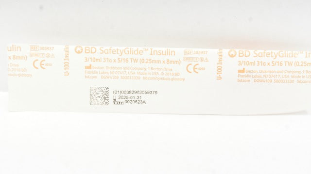 - BD 305937 SafetyGlide U-100 Insulin Syringe 3/10ml 31G x 5/16TW