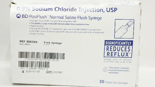 - BD 306545 PosiFlush Normal Saline Flush 5mL Syringe - Box of 30