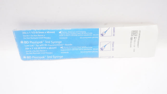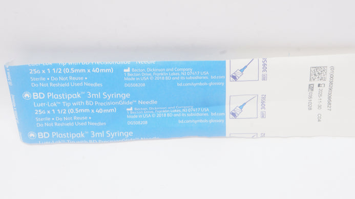- BD 309582 Plastipak Luer-Lok Syringe 3mL w/PrecisionGlide Ndle 25 G x 1-1/2inch