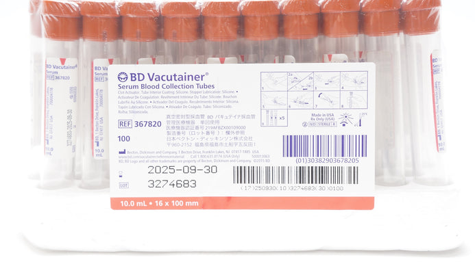 - BD 367820 Vacutainer Serum Blood Collection Tubes 10.0mL 16 x 100mm -Pack of 100