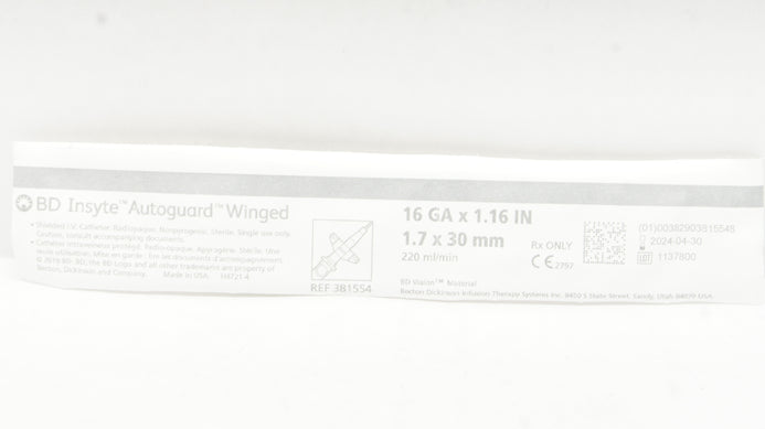 - BD 381554 Insyte Autoguard Winged Shielded IV Cath. 16Ga x 1.16inch 220ml/min(x)