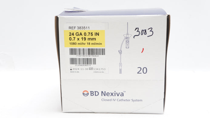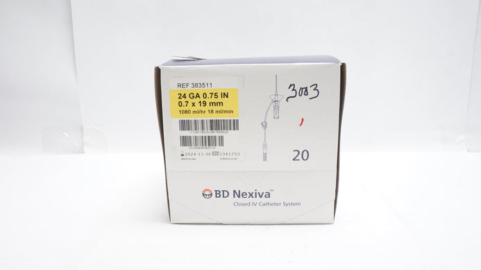 - BD 383511 Nexiva Closed IV Cath. System-Single Port 24GA x 0.75in -Box of 20