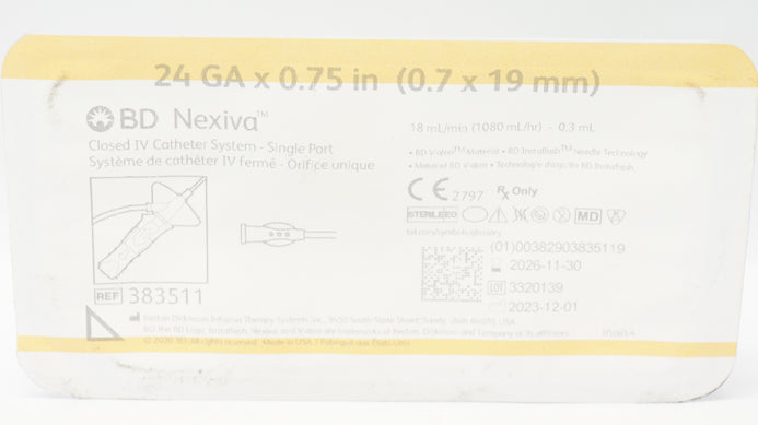 - BD 383511 Nexiva Closed IV Cath. System-Single Port 24GA x 0.75inch