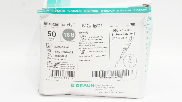 Braun 4251709-02 Introcan Safety PUR IV Cath. 16G x 1-1/4inch - Box of 50