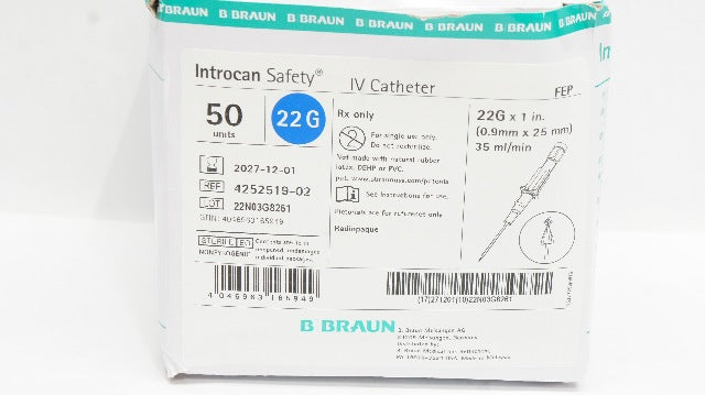 - Braun 4252519-02 Introcan Safety IV Cath. 22G x 1inch x 35ml/min - Box of 50