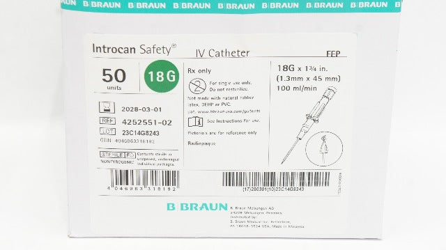 - Braun 4252551-02 Introcan Safety IV Cath. 18G x 1-3/4inch 100ml/min - Box of 50