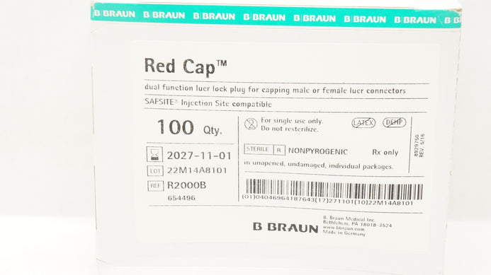 - Braun R2000B Red Cap Dual Function Luer Lock Plug - Box of 100