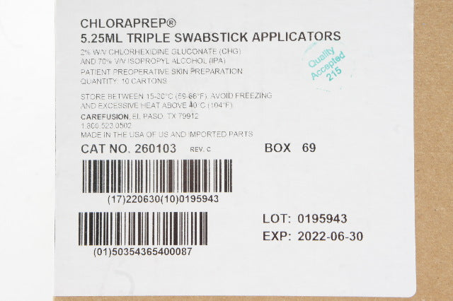 CareFusion 260103 ChloraPrep Triple Swabstick 5.25ml Applicators - Box of 10