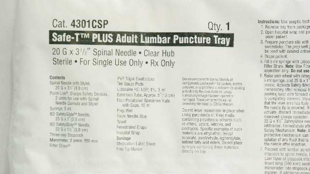 - CareFusion 4301CSP Safe-T PLUS Adult Lumbar Puncture Tray 20Gx3-1/2inch Ndle (x)